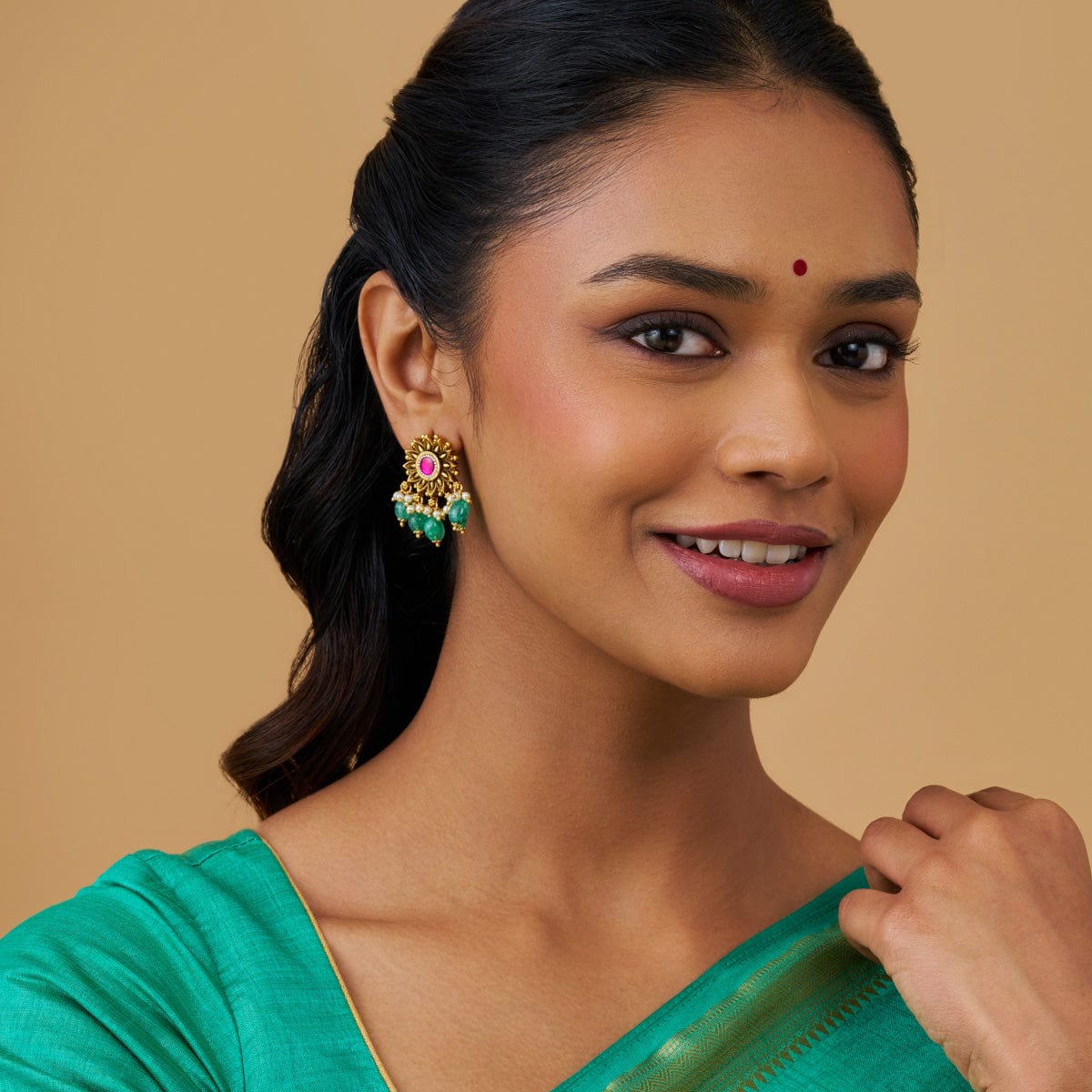 These antique earrings feature rich stones in a ruby-green hue, set in a gold polished base. Crafted with precision from a copper alloy base, they offer a secure push-back closure. Pair them with a traditional lehenga or saree for an elegant and festive touch to your look.