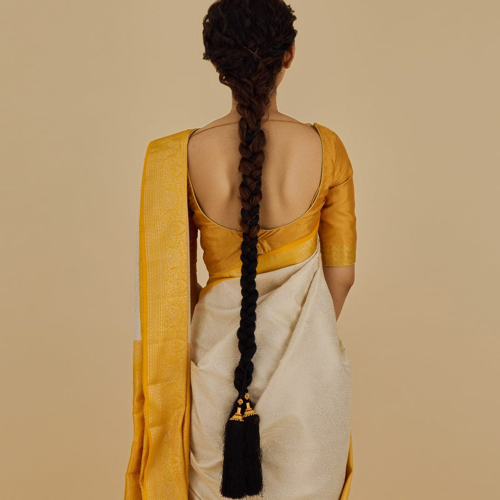 Temple jewellery looks stunning with sarees. To complement the saree's golden border, you may choose a golden temple necklace and matching earrings. For silver zari embroidery on the saree, a silver temple necklace and earrings would be a good match.