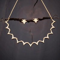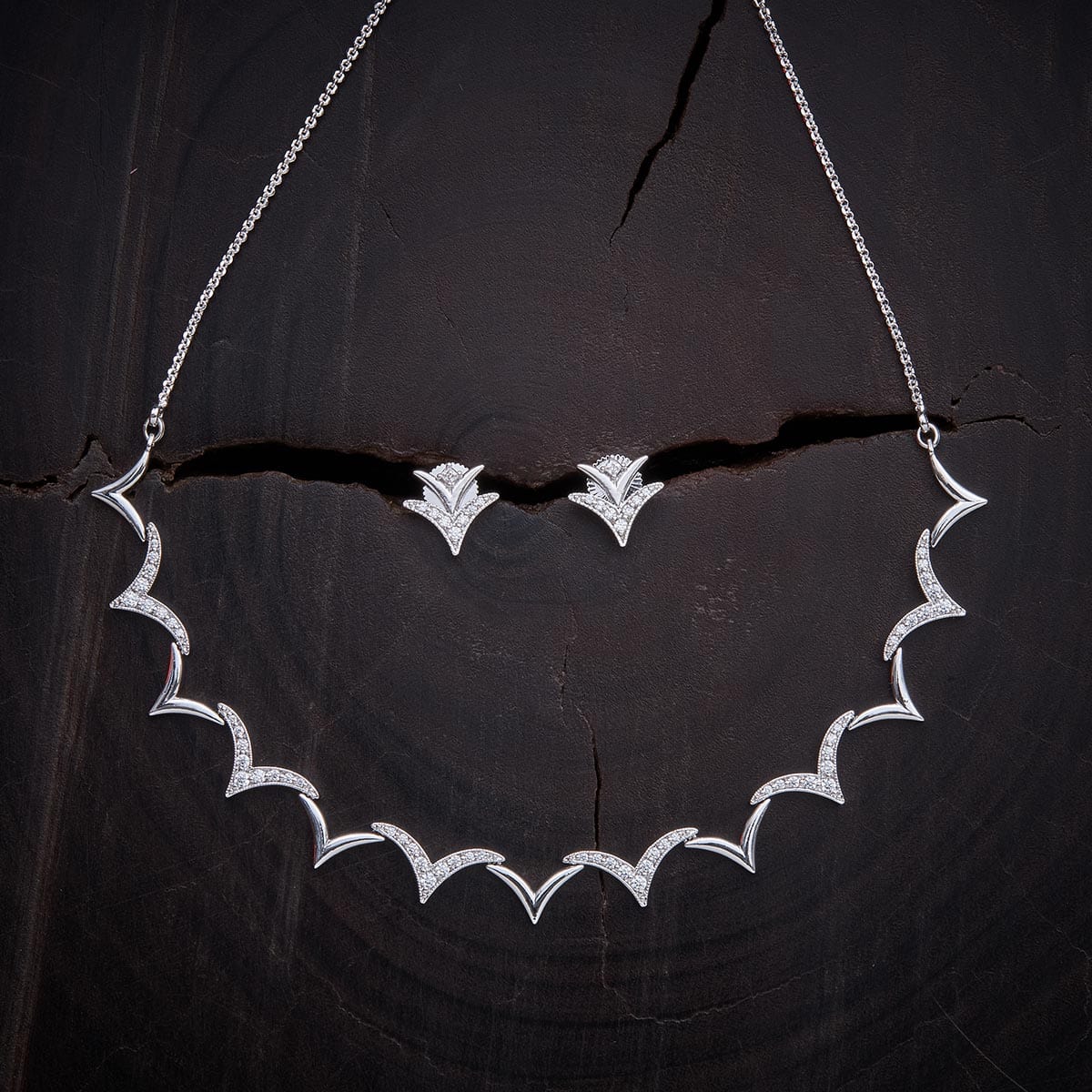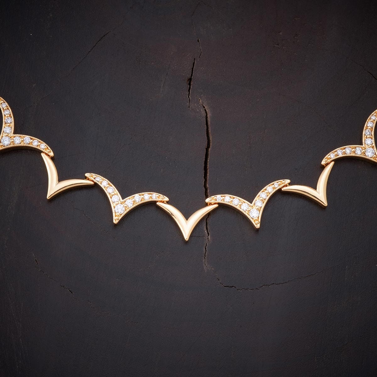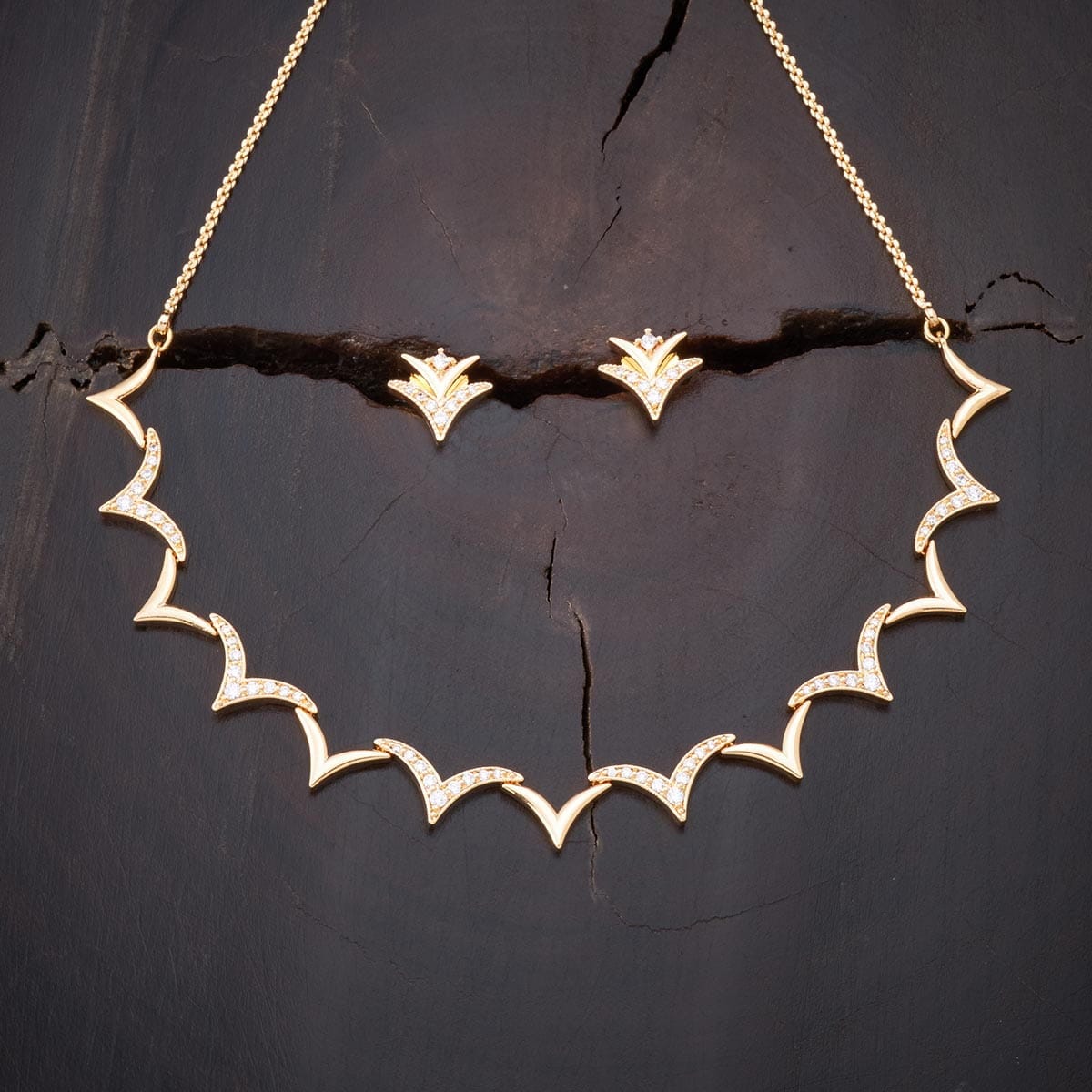 A simple, elegant and graceful piece of short necklace set with a matching pair of delightful earrings polished in delicate gold. The design is modern and minimalistic. Embedded with finely cut unblemished natural white zircon stone, to give that extra shimmer to your look. This magnificent necklace set is best suited with party wear.