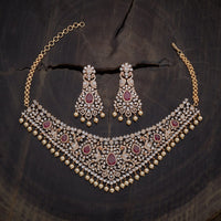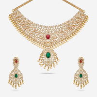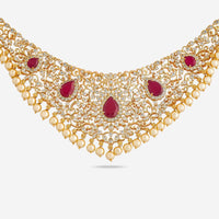 5. Zircon Necklace: Kushal's zircon necklaces come in gold-plated designs, available in ruby and green colours. Our necklaces give a royal vibe to all brides, with embroidered designs and stones for a unique charm. The necklace comes with a jhumka and an adjustable chain, making it a versatile addition to your collection. Elevate your reception look with Kushal's zircon necklace.