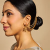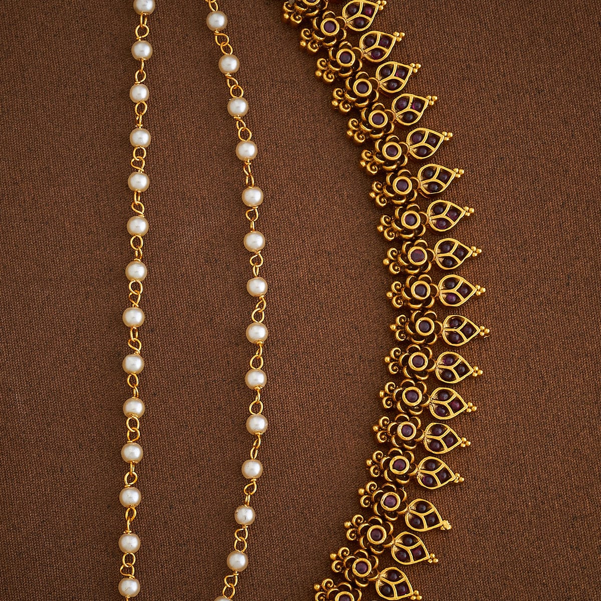 Transform your saree into a statement of tradition with this exquisite antique matil! Decked out in small green or ruby-green synthetic stones, white beads, and a gold polish, this Kushal's Fashion Jewellery piece is the perfect blend of elegance and heritage. Let your hair sparkle with timeless charm!