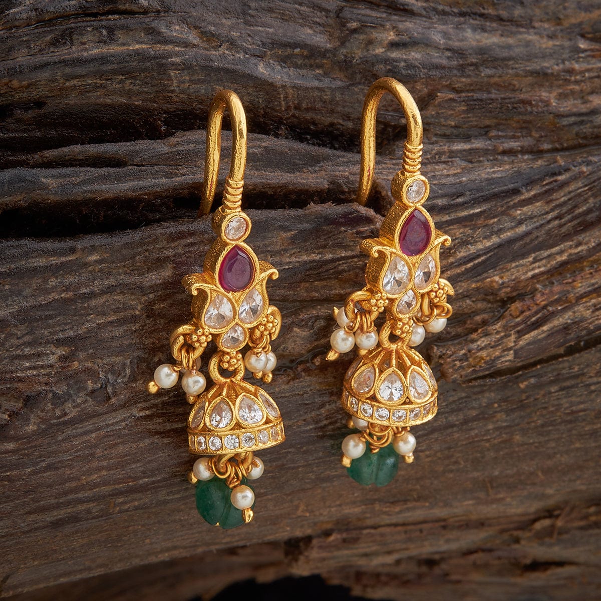 For example, you can easily pair a ruby-green embellished temple earrings jhumka pair with a red lehenga for a regal, unique look. Such a pair can also be utilized again to adorn a simple kurta-palazzo set. In terms of western ensembles, pair it with an embroidered jumpsuit for an indo-western look.