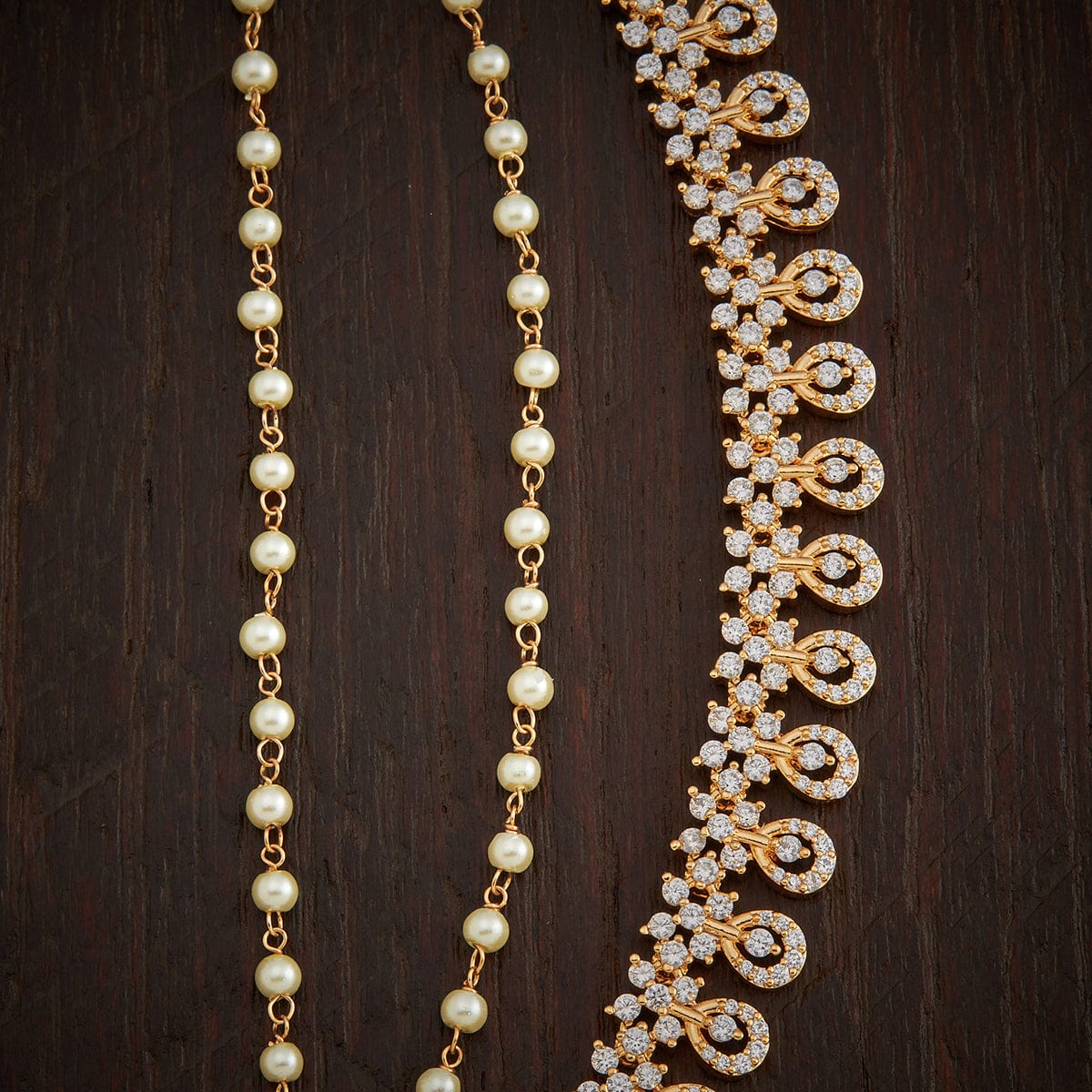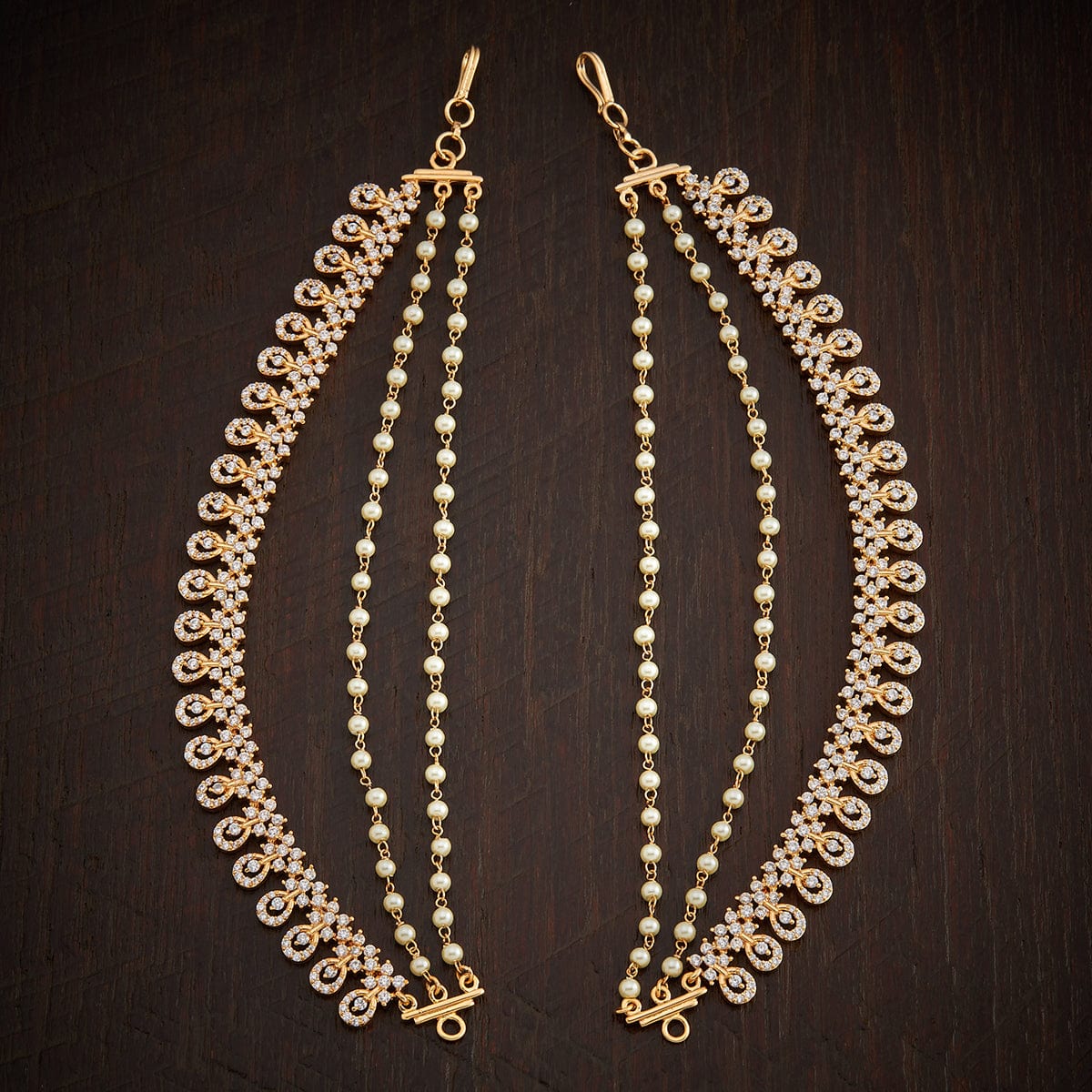 This gold-plated matil is a must have for your bridal outfit, be it a saree or lehenga choli. This hair accessory extends the allure of the jewellery to your hair. Studded with white Zircon stones and pearly beads, arranged in a floral motif, this pair of ear chain is will help you enhance your look on your special day.