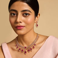 The newest zircon necklace in Kushal's Fashion Jewellery collection exudes understated elegance. This amazing neckpiece is made of zircon stones and copper alloy, two premium materials. It has stunning ruby stones and matching earrings that complement the entire ensemble. Make an impression at any event with your gorgeous new appearance.