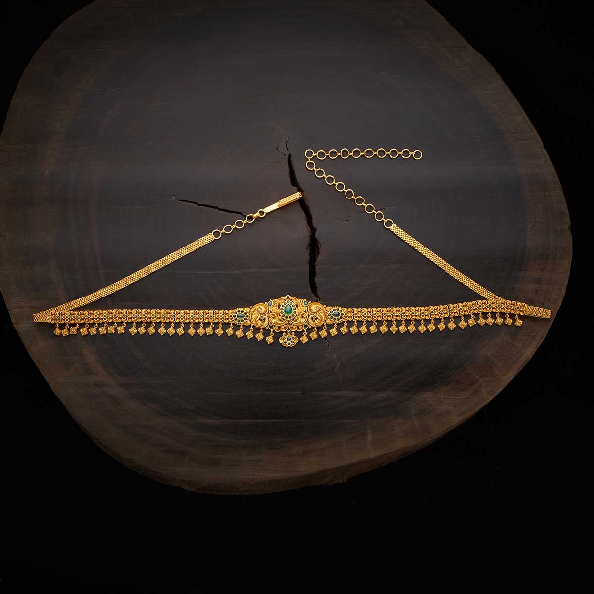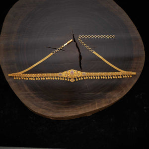 Accentuate your traditional outfit with the Antique Belt. Intricately designed from a copper alloy and embellished with synthetic stones, it’s a blend of elegance and craftsmanship. The gold polish highlights its rich design. At 70 cm, it gracefully encircles the waist, and its adjustable chain ensures it complements every silhouette perfectly.