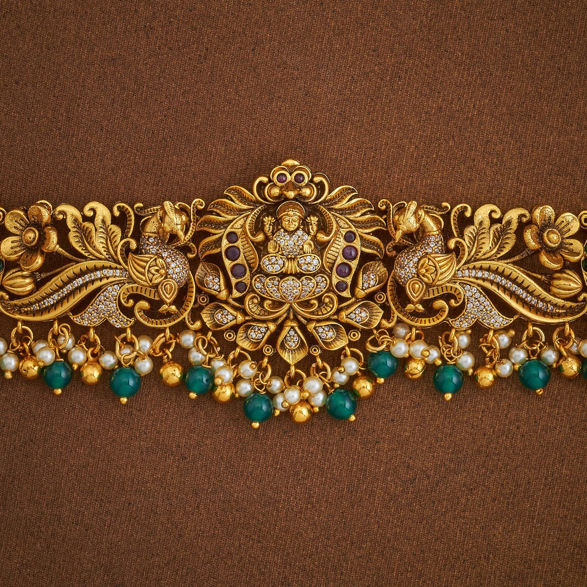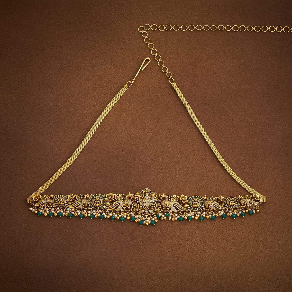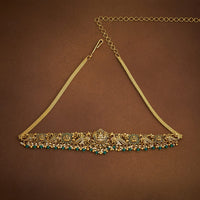 Add a touch of royal flair to your ensemble with this antique belt! The gold polish and ruby-green stones make it perfect for cinching in those flowy sarees or lehengas. It shines best with rich fabrics in deep burgundy, emerald green, or midnight blue. You can also add this to your evening gowns for extra dazzle.