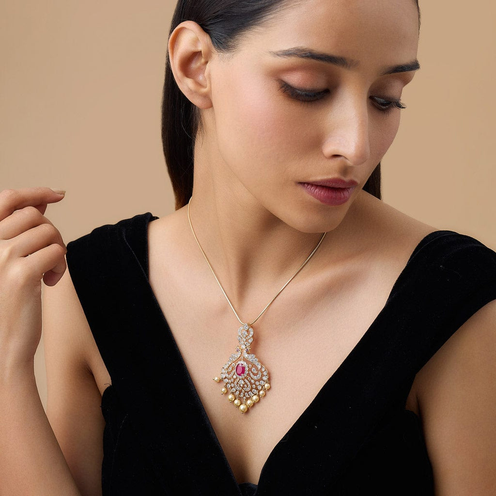 Introducing classic zircon pendant featuring radiant zircon stones in multiple hues and complemented with delicate beads. Graced with a lustrous gold polish, this beautiful pendant set is crafted from sturdy copper alloy base. Add a touch of sophistication to your evening attire with this exquisite piece.